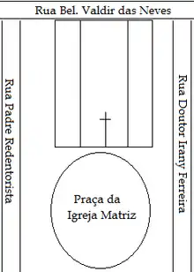The Parish Church of Trindade is located in the Sanctuary Square, in the same area where the gold prospectors Ana Rosa and Constantino Xavier displayed the medallion they found at the disposal of tourists who wished to express their faith. The temple is located between Padre Redentorista Street and Doutor Irany Ferreira Street, in the Vila Santa Inês neighborhood; behind it, it intersects Bacharel Valdir José das Neves Street.[23] The church has a symmetrical and identical facade as seen from the square as well as from the street behind. Besides the two main entrances, there are six other entrances on the side wings; three on each.[24]