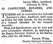 - ↑ "To Carpenters, Builders, and others". The New Zealander. Vol. 10, no. 815. 4 February 1854. p. 3. Retrieved 1 August 2015.
