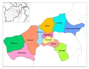 Parwan also spelled Parvan (Pashto and Dari: پروان) is one of the 34 provinces of Afghanistan. It is the largest province of the Greater Parwan region and has a population of about 751,000.[3] The province is multi-ethnic and mostly rural society. The province is divided into ten districts. The town of Imam Abu Hanifa serves as the provincial capital. The province is located north of Kabul Province and south of Baghlan Province, west of Panjshir Province and Kapisa Province, and east of Maidan Wardak Province and Bamyan Province. The province's famous tourism attraction is the Golghondi Hill, also known as “the flower hill,” located in Imam Azam about an hour away from the capital city of Kabul.[5] After Panjshir this province has been considered as one of the main raising points of Afghanistan War against Soviets.