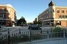 The entirely rebuilt clock tower stands downtown neighboring the city park.