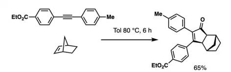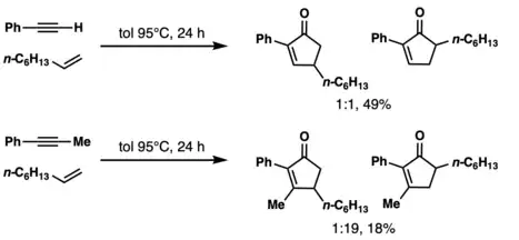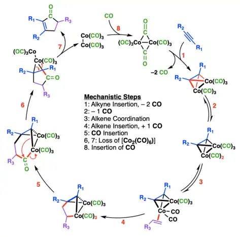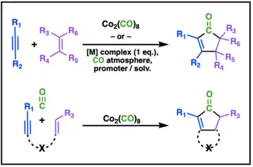 The traditional catalyst is stoichiometric amounts of dicobalt octacarbonyl, stabilized by a carbon monoxide atmosphere.[7] Catalytic metal quantities, enhanced reactivity and yield, or stereoinduction are all possible with the right chiral auxiliaries, choice of transition metal (Ti, Mo, W, Fe, Co, Ni, Ru, Rh, Ir and Pd), and additives.[8][9][10][11]