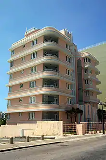 In 1935 he returned to San Juan where he was briefly employed in the Puerto Rico Emergency Relief Administration and later as construction inspector at Casa de España. There, he met Pedro Adolfo de Castro (1894-1936), with whom he developed a close professional relationship. During those years, they developed most of their Art Deco designs. For example, the "Miami Apartments Building" (ca.1935) in the Condado area of San Juan.[10]