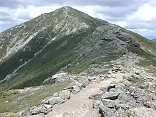 The western lobe is enclosed by the Franconia, Twin, and Bond ranges, though the top of the ridge defining the ranges is outside the Wilderness boundary. Moving clockwise from the south near the Lincoln Woods trailhead, the ridge ascends Potash Knob (2,684 ft; 818 m), an unnamed peak (3,060 ft; 930 m), and Whaleback Mountain (2,586 ft; 788 m) before reaching Franconia Ridge itself at the ledgy summit of Mount Flume (4,328 ft; 1,319 m).[4] From Mount Flume, the ridge dips and rises between peaks in a parabolic manner, flirting with treeline in the cols and running open and exposed at the summits. Peaks crossed at this point of the ridge after Flume include Mount Liberty (4,459 ft; 1,359 m), and Little Haystack Mountain (4,780 ft; 1,460 m), where the ridge rises out of the scrub for good.[4] As it heads north, the ridge assumes a "knife-edge" character, dropping off dramatically on both sides as it crosses Mount Lincoln (5,089 ft; 1,551 m) before reaching its high point at the summit of Mount Lafayette (5,249 ft; 1,600 m).[4][5]