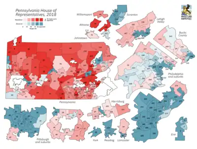 The 2018 elections for the Pennsylvania House of Representatives was held on November 6, 2018, with all districts being decided. The term of office for those that were elected in 2018 began when the House of Representatives convened in January 2019. Pennsylvania State Representatives are elected for two-year terms, with all 203 seats up for election every two years.[1] The election coincided with the election for Governor and one-half of the State Senate. The Republican Party maintained its majority in the House of Representatives despite receiving less than 45% of the popular vote.