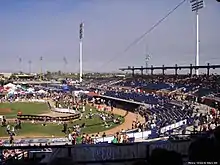 Spring training has a long history in Peoria. From the late 1970s to 1990, Peoria's Greenway Sports Complex served as a minor-league training facility for the Milwaukee Brewers baseball team.[8] This small facility was located at 83rd Avenue and the Greenway Road alignment, the location of the future Peoria Sports Complex. Construction of the new complex was approved in 1990. It was completed in 1994 and was the first Major League Baseball spring training facility in the county shared by two teams.[9][10] The San Diego Padres and Seattle Mariners utilize the complex year-round for spring training and player development.[11] The Sports Complex was also the short-lived home of the Arizona United for the 2014 season before they relocated to Scottsdale.[12]