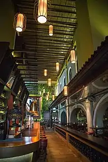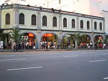 With its historic colonnaded covered walkways, Peranakan Place is currently an attraction on Orchard Road for tourists and locals alike.[6] It is closed off to traffic, and has commercial spaces as well as food and beverage outlets. Peranakan Place as it stands today is a commercial development that holds businesses ranging from F&B to retail. As the front faces the main shopping district of Orchard Road, the historic building receives a higher volume of traffic as compared to the quieter housing areas further in on Emerald Hill Road. The owners and tenants are thus required to abide by strict conservation standards set by the URA to ensure that the integrity of the building is preserved.[7] The display of a Chinese Baroque style of architecture, which uses a mélange of Chinese and European influences, can still be seen from the colourful yet structured façade.