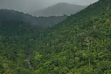 Periyar National Park lies in the middle of a mountainous area of the Cardamom Hills. In the north : The boundary commences from the point nearest to the Medaganam in the interstate boundary up to Vellimalai. and the east Thence the boundary follows the inter-state boundary from Vellimalai to Kallimalai Peak (G.O. (P) No.65/2003/F&WLD dated Thiruvananthapuram, 20 December 03) (1615 M) it is bounded by mountain ridges of over 1,700 m (5,600 ft) altitude and toward the west it expands into a 1,200 m (3,900 ft) high plateau. From this level the altitude drops steeply to the deepest point of the reserve, the 100 metre valley of the Pamba River. The highest peak in the park is the 2,019 m (6,624 ft) high Kottamala, the southernmost peak in India higher than 2,000 metres (6,562 ft). The Periyar and Pamba Rivers originate in the forests of the reserve, both in Mlappara.[3] The other prominent peaks within the park are Pachayarmala, Vellimala, Sunderamala, Chokkampetti mala and Karimala.[4] The topography consists of steep and rolling hills which are thickly wooded. The sanctuary surrounds Periyar Lake, a reservoir measuring 31 km2 (12 sq mi),[5] which was formed when the Mullaperiyar Dam was erected in 1895. The reservoir and the Periyar River meander around the contours of the wooded hills, providing a permanent source of water for the local wildlife.