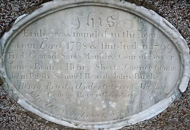 The Pennsylvania Legislature approved a lottery in 1797 to raise funds for the bridge, eventually raising $20,000. The bridge was completed in 1799 at a cost of $60,000, opening on November 2.[8]