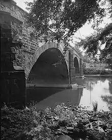 The Perkiomen Bridge, originally built 1798-99 and widened in 1928, is one of the oldest stone arch bridges in the United States still in use. It crosses Perkiomen Creek near Collegeville, Pennsylvania. The bridge's six semi-circular arches cover a total of over 300 feet (91 m). The longest arch spans 76 feet (23 m). Its decorative piers and belt courses are unusual for a bridge this old. A lottery financed $20,000 of the original construction. The bridge carried the main road from Philadelphia to Reading, known at various times as the Manatawny Pike, Germantown Pike, the Philadelphia-Reading Pike, and US 422. Since the construction of the US 422 bypass, the road has been known as Ridge Pike or Old US 422.[3][4][5][6]