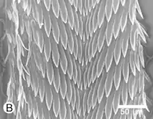 Digestive system: Teeth of the radula are arranged in anteriorly V-shaped rows, each row containing 21–23 teeth with the formula (10-11)-1-(10-11). The central tooth is small, sharp, triangular with pointed cusp. The lateral and marginal teeth are undifferentiated, unicuspid and lanceolate. Lateral teeth are gradually reduced in length and size, outer teeth much smaller and shorter than inner teeth.[1]