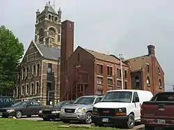 Located behind the courthouse is the old county jail, a three-story brick building.[6] Also constructed in 1887,[1] it succeeded the old courthouse as the jail; the 1857 courthouse included dedicated jail space on its first floor.[2]: 57