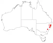 This persoonia grows in heath to wet forests in soil derived from granite, basalt or metasediments but not sandstone. There are disjunct populations in the Ebor and Barrington Tops areas of the New England Tableland and the Hampton district on the Central Tablelands. It is found at altitudes of 1,000–1,500 m (3,000–5,000 ft).[2][4]
