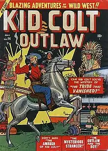 Shortly after this, publisher Martin Goodman's comics division had gone from being known as Timely Comics to Atlas Comics. There Tumlinson was the primary artist on Kid Colt, Outlaw from issues #14-24 (May 1951 - Jan. 1953) before turning over the reins, figuratively speaking, to the character's longtime signature artist, Jack Keller. Tumlinson had previously drawn an anthological Western story, "The Magic of Manitou", for Kid Colt, Outlaw #13 (March 1951). Later, Tumlinson drew Western stories for Atlas' Outlaw Fighters, Two-Gun Western and Wild Western.[4]