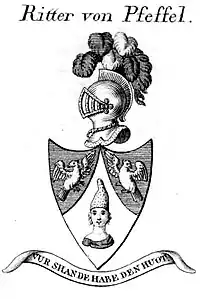 The Pfeffel family (ennobled as von Pfeffel) is a Bavarian-German noble family originally from Neuburg an der Donau in Bavaria. Some family members were ennobled in the Kingdom of Bavaria in the 19th century. The family's history was explored in the BBC series Who Do You Think You Are?, relating to Boris Johnson.[1]