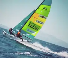 The 16 is the most popular Hobie Cat, both for recreational and racing purposes and as a one-design racer. The boat is 16'7" long, 7'11" wide, and has a mast 26'6" tall, but only weighs 320 pounds. As with the 14, it is intended to be sailed from the beach through the surf, and to be surfed back in on the waves to the beach. Instead of daggerboards or centreboards, the 16 has asymmetrical hulls which act like foils and keep the boat from crabbing, or slipping sideways from the force of the wind. Both jib and main sails are fully battened and total 218 square feet (20 m2). A trapeze is usually used by the crew and helmsman.