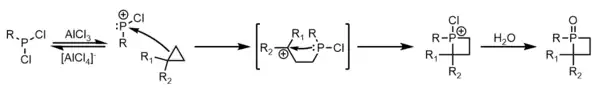 Another way to make phosphetanes comes from the ring-expansion of cyclopropanes, in which it seems a phosphine is directly inserted into a C-C bond.[11][12] The true mechanism of this transformation is similar to that of the McBride synthesis and is sometimes classified as such, with similar advantages and drawbacks. Although relieving the cyclopropane ring strain is of great assistance in the initial C-P bond, exhaustive alkyl substitution to stabilize the formed carbocation is often required. The general mechanism is seen below: