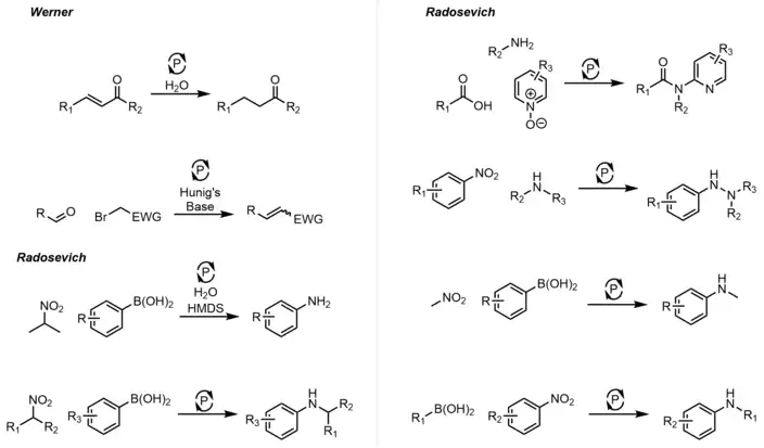 - ↑ Li, Gen; Miller, Steven P.; Radosevich, Alexander T. (2021-09-15). "P III /P V ═O-Catalyzed Intermolecular N–N Bond Formation: Cross-Selective Reductive Coupling of Nitroarenes and Anilines". Journal of the American Chemical Society. 143 (36): 14464–14469. doi:10.1021/jacs.1c07272. ISSN 0002-7863. PMC 8454687. PMID 34473484.