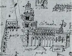 As shown in the same drawing (P/33) of Angelo Rocca, today's clock tower hadn't been built at that time yet. It was built in 1858 based on a project by the architect Corradino de Judicibus.[4] Previously, in the same place where today it is the clock tower there was the seggio, a sort of stage in which the representatives of both nobles and commoners met in order to discuss the issues the city had to face. Initially, the seggio was located in the area of the current chapel of San Biagio (alongside the Church of San Nicola dei Greci); in the end of the 16th century, it was moved to the area where the clock tower is located now; in 1654, it was demolished and rebuilt in the same place.[5]