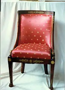 In 1817 President James Monroe purchased a suite of furniture for the White House, which was made famous in Jacqueline Kennedy's TV tour of the White House. The furniture is in the Blue Room.[1] He also produced furniture for Napoleon at Saint-Cloud, for the Tuileries, Joséphine's Château de Malmaison, and also for his brother Joseph Bonaparte. Examples of his work can be seen at Windsor Castle and Buckingham Palace in England. The set of furniture, property of the Yuko Nii Foundation, in the Treasure Room of the Williamsburg Art & Historical Center in Williamsburg, Brooklyn, is of the period when Napoleon was emperor, around 1810, and has the swan motif favored by Josephine, his first wife. It is entirely possible that this set was made for one of Napoleon's or Josephine's rooms.