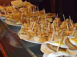 A pincho (Spanish: [ˈpintʃo]; literally "thorn" or "spike"), pintxo (Basque: [pintʃo]) or pinchu (Asturian: [ˈpintʃʊ]) is a small snack,[1] typically eaten in bars, traditional in northern Spain and especially popular in the Basque country, Navarre, La Rioja, Cantabria, and Asturias. They are usually eaten in bars or taverns as a small snack while hanging out with friends or relatives; thus, they have a strong socializing component, and in the Basque country and Navarre, they are usually regarded as a cornerstone of local culture and society. They are related to tapas, the main difference being that pinchos are usually 'spiked' with a skewer or toothpick, often to a piece of bread. They are served in individual portions and always ordered and paid for independently from the drinks. It is not impossible, however, for the same item to be called pincho in one place and tapa in another.