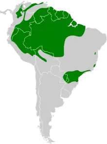 It is found in Argentina, Bolivia, Brazil, Colombia, Ecuador, French Guiana, Guyana, Paraguay, Peru, Suriname, and Venezuela. Its natural habitats are subtropical or tropical moist lowland forest and subtropical or tropical moist montane forest.