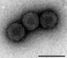 As a member of genus Orthoreovirus, the virion form of PRV is a non-enveloped icosahedral capsid with two layers, the outer and core. The diameter of the total virion encompassing the outer layer is approximately 70 nm, with the inner core layer measuring around 39 nm in diameter.[24]