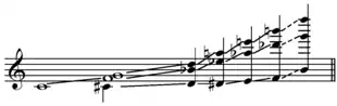 Howard Hanson called this operation of commutative mathematical convolution "superposition"[21] or "@-projection" and used the "/" notation interchangeably. Thus "p@m" or "p/m" means "perfect fifth at major third", e.g.: { C E G B }. He specifically noted that two triad forms could be so multiplied, or a triad multiplied by itself, to produce a resultant scale. The latter "squaring" of a triad produces a particular scale highly saturated in instances of the source triad.[22] Thus "pmn", Hanson's name for common the major triad, when squared, is "PMN", e.g.: { C D E G G♯ B }.