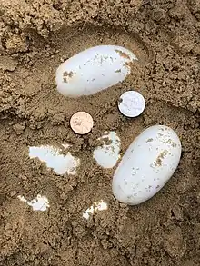 After mating has taken place in spring, clutches of three to 24 eggs are laid in June–August. The eggs are deposited in sandy burrows or under large rocks or logs and hatch after 64–79 days of incubation.[8] They are known to build communal nests, with several females laying eggs in the same spot.[14] The eggs are adherent and quite large, up to 66 mm (2.6 in) long by 45 mm (1.8 in) wide. Hatchlings measure 33–45 cm (13–18 in).[6] Eggs laid on wetter substrate tended to produce larger hatchlings than those laid on dryer substrate.[15]