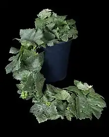 The Pixie Grape is a new type of Vitis vinifera cultivar. The Pixie is a natural dwarf grapevine that is derived from the periclinal L1/L2 chimera Pinot Meunier. These dwarf grapevines tend to have short internodes and prefer to grow flowers instead of tendrils. They grow from 1 foot to 2 feet in height and produce clusters with a size on average of 4 inches. It is simple to cultivate in greenhouses and grows year round. Its purpose was to create an easy tool with which to conduct grapevine research. The grape was developed by grape rootstock breeder Dr. Peter Cousins of the USDA and David Tricoli of the Plant Transformation Facility, University of California Davis.