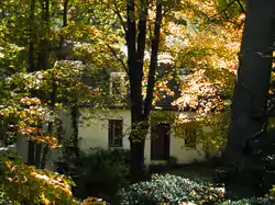 The Plaster House is located in a rural setting of southeastern Southbury, on the south side of Plaster House Road near its western end at Jeremy Swamp Road. It is set on a parcel overlooking Jeremy Brook to the east. The house is a small 1+1⁄2-story masonry structure, built out of small rubblestone and covered in stucco. It has a gambrel roof pierced by two shed-roof dormers, with stone chimneys in the end walls. The main facade is three bays wide, with sash windows on either side of the entrance. The western gable is finished in stone, while the eastern one is framed in wood and finished in clapboards. The interior is divided into two chambers, with the larger one historically serving as a parlor and the smaller one as a kitchen. The stonework of the chimney and fireplaces are fully exposed, an unusual condition that appears to be original.[2]