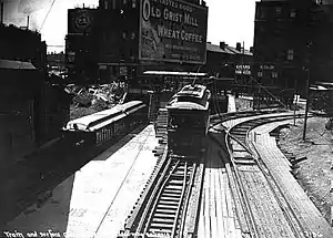 On June 10, 1901, streetcar service through the portal stopped, as the Washington Street Elevated (later part of the Orange Line) was connected to the two outermost tracks. El trains came out of the portal, stopped at a new Pleasant Street station with a center island platform in an open cut, passed under Pleasant Street, and then rose onto an elevated structure. Many surface streetcar lines were truncated to Dudley, the south end of the new El, until late November 1909.