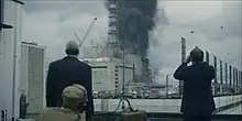 ![]() Valery Legasov and Boris Shcherbina observe a military squad of three helicopters carrying tons of sand and boron, flying close to the reactor to put out the fire, moments before one of them crashes. | |