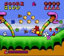 Plok! has two difficulty modes: "Normal" which features the entire game, and "Child's Play" which omits the harder stages and decreases the speed and hit points of enemies.[4] "Plokontinues" are earned if four P-L-O-K tokens are collected, and a token is garnered if a level is finished without dying; if a Game Over occurs, the player will restart with a score of 0, three lives, and at the place the Plokontinue was received.[5] Saving is limited to two "Permanent Continue Positions" after the completion of the Bobbins Brothers and Rockyfella boss fights which the player can return to even after the game is reset,[5] and there is no password feature.