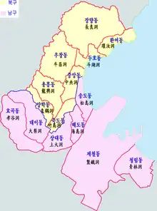 Inset map. Yellow is Buk-gu and Purple is Nam-gu.