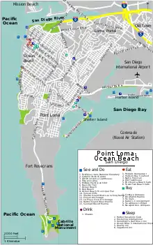 The northwest corner of the peninsula, where the San Diego River flows into the ocean, is a separate community known as Ocean Beach.[4] The southern one-third of the Point Loma Peninsula is entirely federal land, including Naval Base Point Loma, Fort Rosecrans National Cemetery, and Cabrillo National Monument.