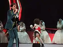 Laka took part in technical rehearsals on 12 and 15 May, followed by dress rehearsals on 19 and 20 May. The Bosnian performance featured Laka in a white and yellow striped t-shirt and a blue-green suit, joined on stage by his sister Mirela Laković in a white dress with apples on and four backing vocalists in wedding gowns.[19] The performance began with Mirela hanging clothes on a washing line and collecting bouquets from the backing vocalists, all of them which then knitted. At the end of the performance, the word "LOVE" was displayed on the clothes. The stage lighting and LED screens displayed various colours.[20][21]