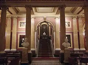 The political club is a feature of Urban politics in the United States usually representing a particular party in a neighbourhood. They were most prominent in the later 19th and early 20th centuries, most famously in Tammany Hall of New York City, which adopted them during the golden age of fraternalism in reaction to a strong challenge from the United Labor Party in 1886.[3] Political clubs were associated with political machines and political boss culture, but also often saw a split between "regular" and "reform" political factions. They formerly often had a prominent local meeting house, but have declined since politics became less neighborhood-based.[4][5][6]