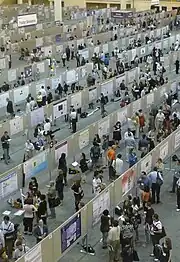 A poster presentation, at a congress or conference with an academic or professional focus, is the presentation of research information in the form of a paper poster that conference participants may view. A poster session is an event at which many such posters are presented. Poster sessions are particularly prominent at scientific conferences such as medical and engineering congresses.[1][2][3]