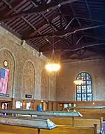 The waiting room, modeled on Grand Central Terminal,[4] is a high gallery lit during daylight by the windows and the three original chandeliers. The 14 benches within are also original finished chestnut pieces. The walls are paneled in wood to eight feet (240 cm), after which the carved stone shows all the way to the cornice. More original woodwork, the stained walnut rafters, is present in the ceiling, possibly modeled after a similar design in San Miniato al Monte, an 11th-century church in Florence, Italy.[4]