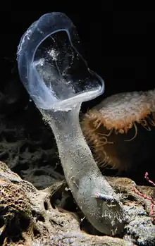 The predatory tunicate (Megalodicopia hians), also known as the ghostfish,[2] is a species of tunicate which lives anchored along deep-sea canyon walls and the seafloor. It is unique among other tunicates in that rather than being a filter feeder, it has adapted to life as an ambush predator. Its mouth-like siphon is quick to close whenever a small animal such as a crustacean or a fish drifts inside. Once the predatory tunicate catches a meal, it keeps its trap shut until the animal inside is digested. They are known to live in the Monterey Canyon at depths of 200–1,000 metres (660–3,280 ft). They mostly feed on zooplankton and tiny animals, and their bodies are roughly 5 inches (13 cm) across.[3]
