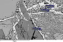 | symplectites | ![]() Intergrowth of fayalite-pyroxene symplectite (grey) against apatite (white) exhibits a symplectitic texture on the right. | |