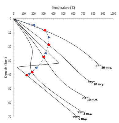 The thermal modeling from Richardson and Thompson (1984) reveals that in every case of thermal relaxation after the tectonic event, there is a large portion of heat equilibrium before being significantly influenced by erosion, i.e. the rate of metamorphism is found to be much slower than duration of the thermal event.[2][3] This infers that the rock is a poor heat conductor, which the maximum temperature experienced by the rock as well as its temperature change are insensitive to erosion rate.[2] Therefore, both the evidence of the maximum pressures and temperatures experienced by the buried layers can be imprinted in the underlying metamorphic rocks.[2] Hence, the buried depth as well as plausible tectonic settings can be deduced.[2] Altogether with dating techniques, geologists can even determine the time scale of the tectonic events in respect to the metamorphic events.[2][3]