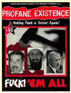 Launched in 1989,[11] the Profane Existence magazine has been described as "the largest of the anarchist Punk fanzines in North America."[12] The magazine deals with a very broad range of topics,[13] including veganism, animal, women's and minority rights, anti-fascist action and the punk lifestyle. It published feature articles, interviews, reports on local scenes around the world, editorials, letters, "how-to" articles, and so on.[4][14] Thompson writes that the zine "functions as [a newspaper] for many Anarcho-Punks, especially those in the Twin Cities area."[15] Until it ceased publication in 1998 Profane Existence was free in the Twin Cities and cost $1–3 elsewhere; then as now customers who order the zine through the mail are only charged for shipping.[7] The zine was initially published in a black and white tabloid format.[15] It switched to an 8½ x 11" magazine format with issue #23 (Autumn 1994) but returned to a tabloid format (now with color front and back covers) with issue #38 (Spring 2000).[15]