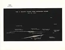 The first Project FIRE reentry package was propelled to an altitude of 122 km by an Atlas D launch vehicle (missile 263D).[5] Following a coasting phase that reached an apogee exceeding 800 km, the velocity package initiated the reentry vehicle's trajectory, plunging it into a trajectory at a velocity of 11,300 meters per second with a minus 15 degree trajectory.[5] As the spacecraft descended towards Earth, a solid-fuel Antares II rocket positioned behind the payload ignited for 30 seconds, elevating the descent speed to 40,501 kilometers per hour.[5] Temperature data from the spacecraft's instruments were transmitted to the ground, indicating an estimated exterior temperature of 11,400 K.[5] Approximately 32 minutes post-launch, the spacecraft made impact into the Atlantic Ocean.[5]