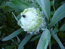 The species is also called queen sugarbush,[2][6] bearded sugarbush or woolly beard. In the Afrikaans language the vernacular names baardprotea, baardsuikerbos, baard-suikerbos, koninginprotea, suikerbosprotea, wolbaardsuikerbos and wolbaard-suikerbos have all been recorded for the plant.[2]