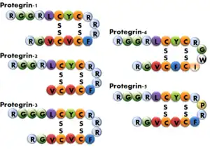 - 1 2 3 Kokryakov VN, Harwig SS, Panyutich EA, Shevchenko AA, Aleshina GM, Shamova OV, Korneva HA, Lehrer RI (July 1993). "Protegrins: leukocyte antimicrobial peptides that combine features of corticostatic defensins and tachyplesins". FEBS Letters. 327 (2): 231–6. doi:10.1016/0014-5793(93)80175-T. PMID 8335113.