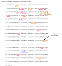 The El Dorado program through Genomatix was used to predict this list of transcription factors that are likely to bind to the promoter region of FAM46B. Numerous E2F sites are predicted, in addition to numerous Zinc Finger transcription factor sites, several E-box binding factors and TWIST homologs. The binding sites are not evenly distributed within promoter region. The largest clustering of binding sites was located around base 177 of the promoter, which is about 600 base pairs upstream from the start of transcription for FAM46B.[9] The image below shows selected transcription factor binding sites for the top twenty matches identified by El Dorado that are on the antisense strand.