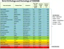 Distant homologs of FAM46B are present in Drosophila and nematodes such as Caenorhabditis elegans. There are no orthologs of FAM46B in plants, protists, or fungi.[11]