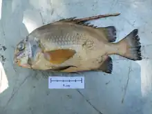 - ↑ P. C. Heemstra (2001). "Ephippidae (spadefishes (batfishes)". In Carpenter, K.E. & Neim, Volker H. (eds.). The Living Marine Resources of the Western Central Pacific Volume 5: Bony fishes part 3 (Menidae to Pomacentridae) (PDF). FAO Species Identification Guide for Fishery Purposes. FAO Rome. p. 3620.