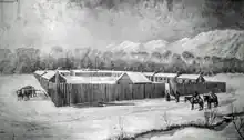 The Battle at Fort Utah (also known as the Provo River Massacre,[2] or Fort Utah Massacre[3]) was a violent attack in 1850 in which 90 Mormon militiamen surrounded an encampment of Timpanogos families on the Provo River one winter morning,[4]:114 and laid siege for two days, eventually shooting between 40 and 100 Native American men and one woman with guns and a cannon during the attack as well as during the pursuit and capture of the two groups that fled the last night.[4]:131–132[5][6]:208 One militiaman died from return fire during the siege. Of the Timpanogos people who fled in the night, one group escaped southward, and the other ran east to Rock Canyon.[1] Both groups were captured, however, and the men were executed. Over 40 Timpanogos children, women, and a few men were taken as prisoners to nearby Fort Utah. They were later taken northward to the Salt Lake Valley and sold as slaves to church members there.[7]:276 The bodies of up to 50 Timpanogos men were beheaded by some of the settlers and their heads put on display at the fort as a warning to the mostly women and children prisoners inside.[6]:223[8]:106[4]:132